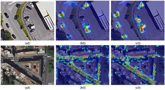 Heatmap visualization results on the SIMD dataset. (a1–a3) represents the original images; (b1–b3) represents the heatmap visualization results of YOLOv7-Tiny; (c1–c3) represents the heatmap visualization results of the method we proposed.