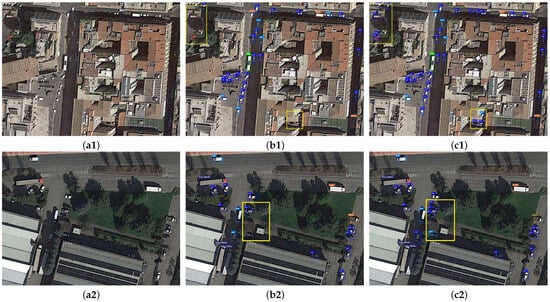 The visualization results of baseline and MHLDet on the SIMD dataset. (a1–a6) represents the original images; (b1–b6) represents the visualization results of YOLOv7-Tiny; (c1–c6) represents the visualization results of the method we proposed. The yellow boxes show the differences between YOLOv7-Tiny and MHLDet.