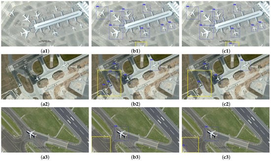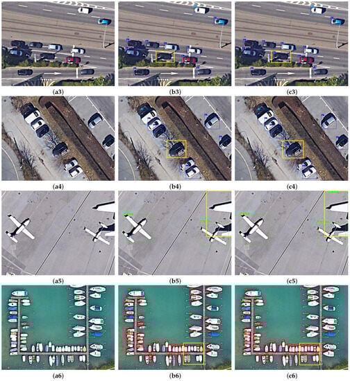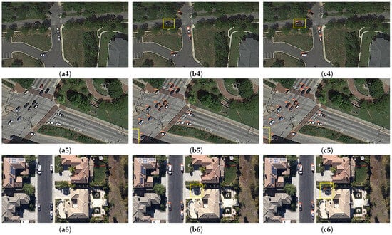 Comparison of different visualization results on the UCAS-AOD dataset. (a1–a6) represents the original image; (b1–b6) represents the visualization results of YOLOv7-Tiny; (c1–c6) represents the visualization results of the method we proposed. The yellow boxes show the differences between YOLOv7-Tiny and MHLDet.