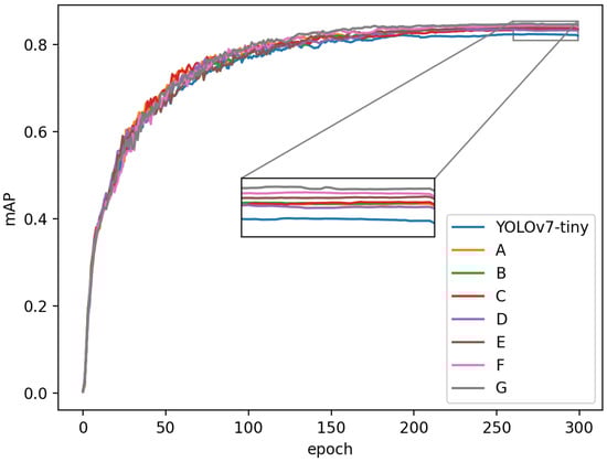 Comparison of experimental mAP for ablation. A: SimAM; B: VNFE; C: SPPE; D: CACL; E: SimAM + VNFE; F: SimAM + VNFE + SPPE; G: SimAM + VNFE + SPPE + CACL.