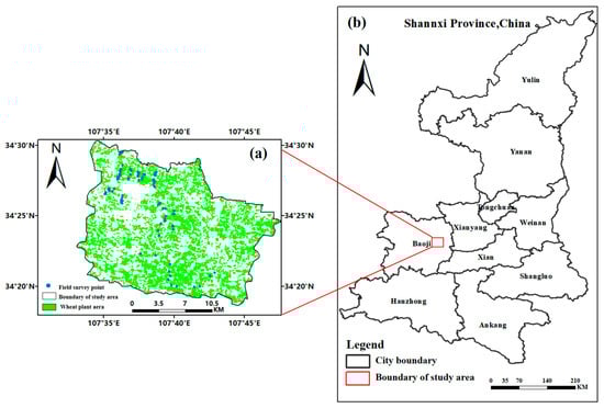 The geographical location of the study area and spatial distribution of sample points. (a) The distribution of wheat fields and survey points within the study area. (b) The approximate location of the study area in Baoji City, Shaanxi Province, China.