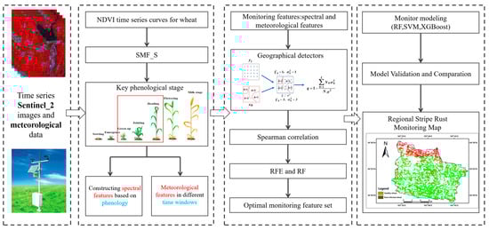 The remote sensing monitoring of wheat stripe rust at a regional scale based on geographical detectors mainly includes the following: (1) extracting key phenological stages of stripe-rust occurrence and development using Sentinel-2 time-series data; (2) the construction of monitoring features by integrating the multi-source data with phenological information, incorporating the spatial-difference information of the disease; and (3) employing geographical detectors to perform feature selection based on the spatial distribution of wheat stripe rust in the study area and establishing a monitoring model for disease detection. The overall research framework is illustrated in Figure 2.