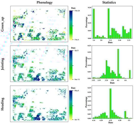 The accuracy of the extracted key phenological stages of wheat was validated using the phenological data from the Fengxiang agricultural meteorological station for the years 2020–2021, as shown in Figure 3. For the green-up stage, the field observation date was February 3rd, and most of the wheat in the extraction results were located on 4th February and 12th February. As for the jointing stage, the field observations were made on 26th March, and the extraction results showed that 75% of the wheat were in the jointing stage between 24th March and 1st April. Regarding the heading stage, the field observation date was 23rd April, and the extraction results indicated that the majority of the wheat reached the heading stage on 24th April. The phenological extraction results demonstrated that during the early growth stages, there were significant differences in the growth status among the different wheat plots. However, as the wheat continued to grow, the growth status gradually became more consistent, which is consistent with previous research findings [77]. Through validation, the extracted dates for various wheat phenological stages were found to be highly consistent with the dates recorded at the agricultural meteorological station. Based on the SMF-S model and the established reference curve, we extracted the key phenological stages of wheat in the study area, as shown in Figure 4. The extraction results indicated that the northwest and central regions of the study area exhibited significantly earlier jointing and heading dates compared to other regions, which aligns with the findings from the field surveys.