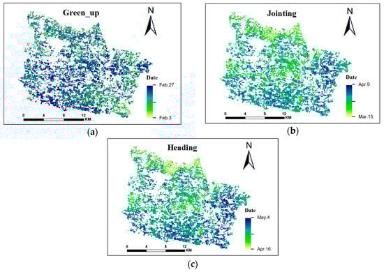Results of the wheat-phenological-stage extraction in the study area. (a–c) represent the extraction results for wheat green-up stage, jointing stage, and heading stage in the study area, respectively.