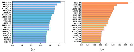 Top 20 ranked features in the geographical detectors’ and ReliefF’s calculation results. (1) Naming rules for the spectral features: xxx_t, xxx represents vegetation index, t represents the initial letter of the phenology, and MSR_H corresponds to the modified simple ratio (MSR) for wheat on the date of heading. It is worth noting that the two-stage normalized vegetation indices and two-stage ratio vegetation indices are named nxxx_t and rxxx_t, respectively. For example, nMSR_JH represents the normalized value of MSR from the jointing to heading stages. (2) Naming rules for the meteorological features: xxx_tm, xxx represents the meteorological variable, t represents the initial letter of the phenology, and m represents the window size or the initial letter of the phenology, e.g., SSD_H15 represents the average sunshine duration in the 15 days before the date of heading. (a) Geographical detectors’ results; and (b) ReliefF results.