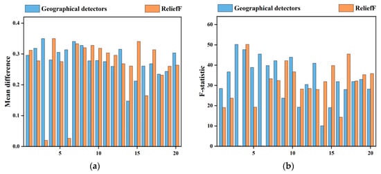 The mean differences and F-statistic between the healthy and diseased samples for the top 20 ranked features computed using geographic detectors and ReliefF, respectively. (a) Mean differences between the healthy and diseased samples. (b) F-statistic between the healthy and diseased samples.