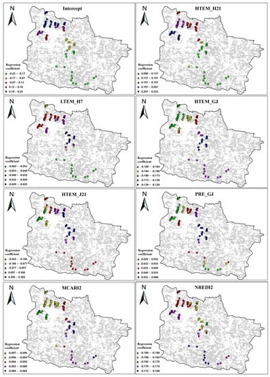The constant term, also known as the intercept, represents the average level of the dependent variable’s predicted values. In this study, it was correlated with the average DI, where higher values indicated more severe disease in the sampled points. The spatial distribution of the intercept revealed a gradual reduction in the severity of wheat stripe rust from the north to south. After standardization, the absolute values of the coefficients of the independent variables can be used to evaluate their impact on the dependent variable. Larger absolute values indicate a greater importance in the variable. Based on the absolute values of the regression coefficients, the features can be categorized into four levels as follows: (1) 0~0.1: LTEM_H7, PRE_GJ, RHU_H15, MCARI2—these features had the smallest importance. (2) 0.1~0.2: HTEM_H21, HTEM_GJ, NREDI2—these features had a relatively smaller importance. (3) 0.2~0.3: WIN_J7, WIN_G21—these features had a relatively higher importance. (4) 0.3~0.4: HTEM_J21, SIPI—these features had the highest importance. The spatial distribution of the regression coefficients of all the features showed that HTEM_H21, HTEM_J21, SIPI, and WIN_J7 exhibited significant differences in the coefficients across different regions. For example, the spatial distribution of the regression coefficient for HTEM_H21 indicated that the average maximum temperature in the 21 days before heading had a greater impact on the occurrence and development of wheat stripe rust in the northern region compared to the southern and central regions. Apart from the above four features, the regression coefficients of the other features did not exhibit significant spatial-distribution differences across the entire study area.