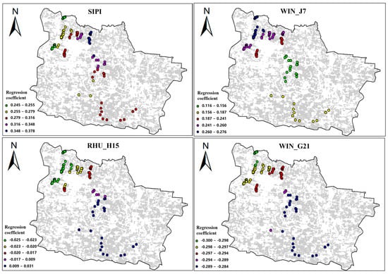 Although the geographical detector method is based on the spatial distribution of the independent variable X and the dependent variable Y for model computation, its resultant value, the q-value, is a global value and cannot depict the spatial-distribution details of each independent variable. To clarify the spatial relationships between the features in the optimal monitoring feature set and DI, this study employed the multiscale geographically weighted regression (MGWR) method for further exploration. MGWR allows for the weighting and modeling of observation points at different spatial scales. During the MGWR modeling process, we standardized each feature to eliminate the dimensional differences between the different features. Figure 8 illustrates the regression coefficients of the 11 features at all sample points.