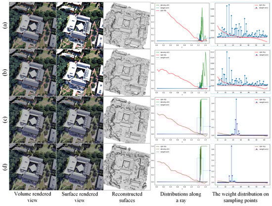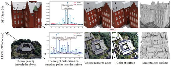 The latest image-based photogrammetry technique, known as neural rendering [8,10,11,12,13,14,15,16,17], employs continuous functions to represent the geometry and appearance of a 3D scene, and it encodes these continuous functions, using neural networks. Additionally, it employs differentiable rendering, to transform the 3D scene into an image, allowing for end-to-end optimization of neural network parameters, by minimizing the disparity between the rendered image and the input image. More specifically, there are two types of rendering manners in neural rendering: surface rendering [8,15,16,17], and volume rendering [13,14,18,19,20,21]. Recent works have tended to use volume rendering to reconstruct 3D surfaces, because it has stronger robustness and is less prone to getting stuck in local minima, compared to surface rendering. However, compared to the impressive performance on indoor datasets, such as DTU [22], high-quality 3D surface reconstruction using volume rendering still remains challenging for remote sensing scenes. A major reason for this dilemma is that the biases that exist in current volume rendering paradigms [13,14,21] are greatly amplified when applied to remote sensing scenes. Furthermore, the view sparsity that characterizes these scenes introduces serious geometric ambiguity.