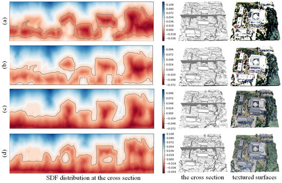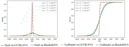Despite NeRF [21]’s success in the task of novel view synthesis, the surfaces extracted from the density field are usually noisy [18], and it is difficult to determine a suitable density threshold, to extract the surface from the density field. Therefore, subsequent improvements have attempted to represent scene geometry with an SDF function [23] and have introduced an SDF-induced volume density , to enable SDF-based volume rendering [13,14]. This approach allows for the extraction of smooth surfaces from the zero set of the SDF.