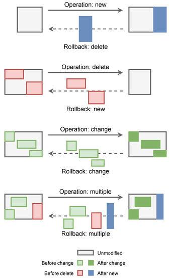 As shown in Figure 4, each of the operations that can be performed on a version of a point cloud dataset implies a series of sets of points to be created, deleted or modified. For each version, there is a rollback point cloud file (RPCL) to perform the transition to the previous version (if any). This file is stored in a standard format for point clouds. In the developed prototype, we use the LAZ format since it provides advanced data compression, which is ideal for storing the historical data in version control. This is because it takes advantage of spatial coherence to perform a coordinates delta compression, so it produces files with the smallest possible storage footprint. Therefore, this file stores a point cloud with all the necessary attributes, including custom fields supported by the LAZ format. In fact, it can be loaded and rendered at any time to check it. These points are used to perform a rollback, and it is the command file that saves the information on how to carry out the process, which is explained next.