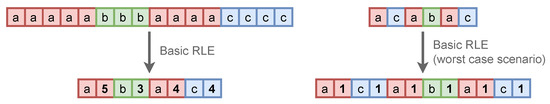 RCMD data can be compressed using a combination of several strategies. One of the most notable aspects when generating a vector of point restore commands is that many of them form groups of referenced indices that are consecutive, either references to points in the RPCL or in the current version cloud. This can be used to perform compact encoding based on a Run Length Encoding algorithm (RLE) [44]. RLE produces compact representations of elements that are often repeated. An example can be seen in Figure 6. This algorithm works very well when there are a large number of sequences of equal values, which usually occurs with data that have low entropy [44]. The main problem with classic RLE is that in the worst case, when the longest sequence of equal values is 1, the encoded data become twice the size of the original, which defeats the purpose of data compression (see Figure 6). To avoid this, we use an adapted RLE algorithm (A-RLE from now on) that is based on a compact coding oriented both to isolated points and to sequences of consecutive points (point strips).