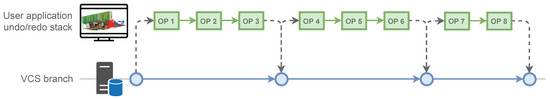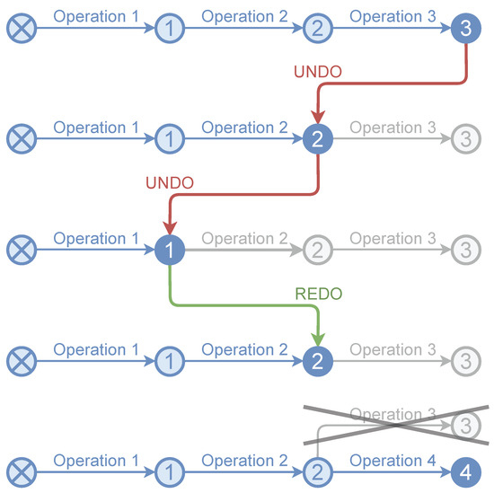 The undo and redo operations are very common in any type of editing software, from word processors to 3D modelers or video editors. The undo option allows us to return to the situation prior to performing the last editing operation, while the redo option involves redoing an operation reversed by an undo. Figure 7 shows an example. This functionality is closely related to the VCS. In fact, it can be considered a specific type of it, with only one branch and whose data are not usually stored in secondary memory. The usual data structure to implement the undo/redo functionality is a stack. In our proposal, the undo/redo stack becomes relevant for two reasons. First of all, some point cloud editing applications (especially LiDAR-based) do not have this type of functionality. Second, having the undo/redo option indirectly optimizes operating version control in interactive applications. Moreover, performing a rollback with information stored in memory is very fast.