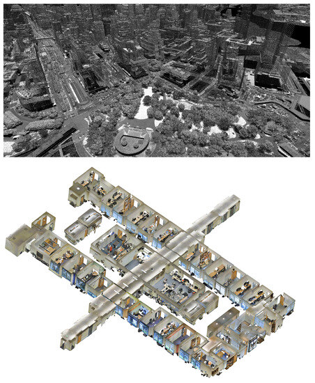 We used two datasets for the experiments (see Figure 9). The goal was to have data from airborne lidar and terrestrial lidar, with different point densities and spatial distributions. Both the complete versions and specific subsets were used for the tests. The first dataset is a part of the Manhattan Island from NY City [47] (2017, WGS84 Zone center −74.002447E, 40.708918N, 4.42 km × 2.27 km, 325 M points in a single LAZ file). The second dataset is the Stanford 3D Indoor Scene Dataset (S3DIS) [48], which is divided into 6 areas with 271 rooms. A single LAZ file version of area-1 (44M points) was used.