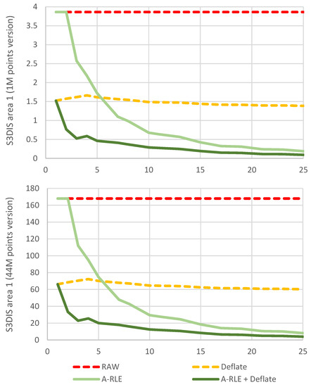 As can be seen, larger point strips produce more compact commands that are much more compressed with the A-RLE algorithm. Although this simulation presents unrealistic conditions, the influence of the length of the point strips on the RCMD restore commands can be seen. In real cases, this depends on the type of editing that is performed on the point datasets. For example, a noise filtering operation tends to produce short strips (2–4 points), while erasing by large polygonal areas tends to generate larger strips. It should be noted that unmodified points also generate strips of points for the RCMD. When modifications affect only a few points in the cloud edited, few large strips are generated, resulting in an RCMD that is compressed to a few bytes. For all the above, it is shown that the approach proposed for the compression of RCMD data (A-RLE + Deflate) is the most efficient.