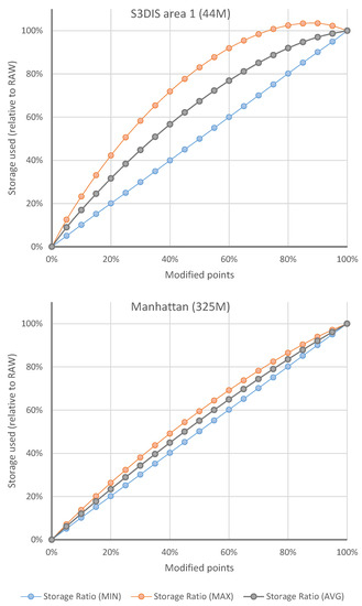 Influence of the number of points modified on the size of the generated delta files. The x-axis shows the percentage of modified points out of the total points in the dataset. The y-axis shows values of storage space used as the percentage of the full versions of the dataset (RAW).