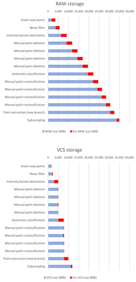 As can be seen in Figure 12, the storage footprint is much smaller in the VCS than with the RAW approach. It can be argued that some of the editing operations need not generate a complete new version of the dataset. For example, manual point removal sessions could be compacted into one. However, it must be taken into account that many of the operations, especially those carried out interactively, have a very high working time, so not having previous versions can mean a high cost in case of errors. In addition, the proposed system allows for undo/redo stack management, as presented in Section 4.6. This means that fast operations can generate intermediate versions in the memory of the computer, allowing data to be restored in the event of an error, without using VCS storage. It should also be mentioned that it is possible at any time to compact several VCS incremental versions into a single delta increment, in order to reduce the storage footprint on consolidated versions.