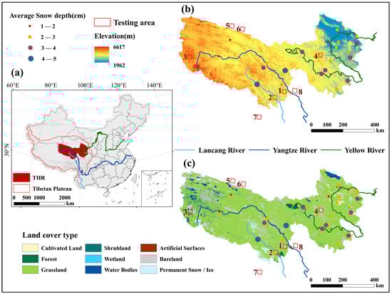 Study area overview: (a) Location of the THR. (b) Topographic distribution of the THR. (c) Land cover types in the THR. The points represent the average snow depth at each station during 2001–2013.The rectangular frames 1–8 represent 8 testing areas for evaluating the performance of the snow cover discrimination model (SCDM) at the local spatial scale.