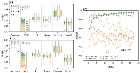 As depicted in Figure 3a, the mean values of accuracy, AUC, F1, kappa, and precision reached their peaks when Ntree was set to 1000. Concurrently, the mean value of recall was notably high. Hence, based on this observation (i.e., Ntree = 1000), as illustrated in Figure 3b, the highest mean values for accuracy, AUC, F1, kappa, precision, and recall were achieved when Mtry equaled 2. More specifically, as demonstrated in Figure 3c, with Ntree set at 1000 and Mtry at 2, a fluctuating trend was observed in the model metrics when ratio was less than 19. Accuracy oscillated within the range of 96.07–99.47%, kappa within 0.9208–0.9520, F1 within 0.9366–0.9636, AUC within 0.9843–0.9940, precision within 0.9559–0.9971, and recall within 0.9065–0.9483. However, the model metrics achieved stability when ratio exceeded or equaled 19. During this phase, accuracy fluctuated between 99.49% and 99.60%, kappa between 0.9370 and 0.9473, F1 between 0.9393 and 0.9498, AUC between 0.9881 and 0.9940, precision between 0.9459 and 0.9498, and recall between 0.9233 and 0.9434. Therefore, considering the metrics and the computational overhead of the model, the parameters Ntree, Mtry, and ratio within the SCDM were determined as 1000, 2, and 19, respectively.