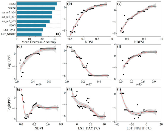 - The spectral information of snow cover was an important auxiliary variable in snow cover discrimination. For example, the NDSI, NDFSI, ref4, ref3, ref7, and NDVI appeared as crucial indicators for the SCDM, and a more pronounced improvement in model performance could be achieved by considering both the NDVI and LST.