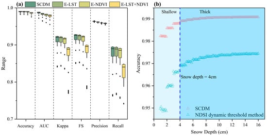 (a) Comparison of the snow cover discrimination results of the SCDM: SCDM excluding LST (E-LST), SCDM excluding NDVI (E-NDVI), and SCDM excluding both LST and NDVI (E-LST + NDVI). (b) Snow cover discrimination accuracy based on the NDSI dynamic threshold method and SCDM.
