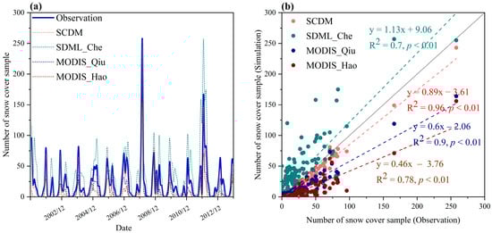 (a) Comparison of four methods of discriminating snow cover samples with station observations during 2001–2013 (the “number of snow cover sample” refers to the sum of snow cover samples at a given time for all stations), and (b) correlation analysis between station observations and SCDM, SDML_Che, MODIS_Qiu, and MODIS_Hao.