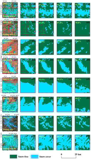 The SCDM was employed to assess snow cover discrimination across different regions, encompassing diverse terrain, imaging times, and snow cover fractions. To evaluate the spatial discrimination capability of the SCDM, four areas within the study region and four areas outside the study region were selected (as depicted in Figure 2 and Figure 7(a1–h1)). In the process of selecting Landsat-7 ETM images corresponding to the testing areas, careful consideration was given to factors such as spatial/temporal heterogeneity, known to influence the generalization ability of the model. In this manner, the spatial generalization capacity of the SCDM was quantitatively assessed to the maximum extent. The specific methodology is outlined as follows: First, Landsat-7 ETM images were selected and subjected to automatic classification using the ISODATA algorithm to extract snow cover, generating binary images. These images were then resampled to a spatial resolution of 500 m (Figure 7(a2–h2)) and used as the reference “true values”. Next, auxiliary variables corresponding to the same dates and regions (selected by the SCDM) were extracted. The SCDM was then applied, binarizing the model output and generating binary images (Figure 7(a3–h3)) (SCDM). Additionally, the MODIS_Qiu (Figure 7(a4–h4)) and MODIS_Hao (Figure 7(a5–h5)) datasets were extracted for spatial comparison.