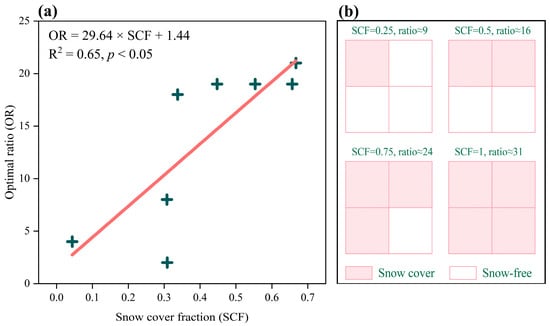 During the development of the SCDM, we identified the ratio parameter as a crucial factor influencing the model’s performance. In the parameter optimization stage, the highest overall performance (on average) of the SCDM was achieved at ratio = 19. However, during the onsite validation stage, the situation was different. In other words, the SCDM did not necessarily present the highest accuracy at ratio = 19 in different validation areas. This disparity was assumed to be possibly linked to the snow cover fraction (SCF) within the validation areas. Hence, SCF was calculated for each area based on the results of Landsat-7 ETM image classification, and the optimal ratio (OR) was further subjected to a simple linear regression analysis. As depicted in Figure 8a, a significant positive correlation emerged between these two variables (p < 0.05), with an R2 value of 0.65. This finding suggests that the optimal ratio for the SCDM tends to increase with a corresponding increase in SCF. Therefore, different ratio values are recommended for different SCFs, as illustrated in Figure 8b. It is essential to note that the optimal ratio was not 1 but approximately 16 when the SCF reached 0.5. This peculiarity might stem from the greater complexity of surface characteristics in snow-free areas compared to snow-covered areas. Consequently, the SCDM might require a larger number of snow-free samples to effectively capture the distinct surface features in such regions.