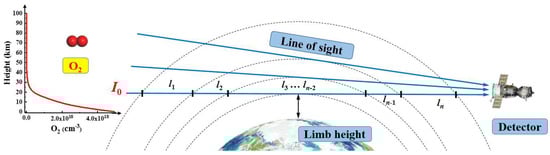 The photochemical interaction and spectral emission transition mechanism have become important factors that affect the detection of O2 in the atmospheric wind field [21]. The infrared atmospheric spectral information and radiation characteristics determine the theoretical design of the detector observing the O2 infrared atmospheric band and the accuracy of the radiation model for calculating the emission spectrum of the O2(a1Δ) → O2(X3Σ) band [22]. Figure 1 shows the schematic diagram of O2 limb detection, where represents the initial radiance, and represents the length of the nth layer.