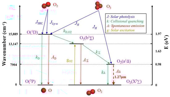 In the earth’s atmosphere, the emission radiance in the near infrared region at 1.27 µm occurs when molecular oxygen in its first excited electronic state O2(a1Δ) spontaneously relaxes to its fundamental state O2(X3Σ). This is the source of oxygen molecular radiation at the 1.27 μm band [15]. Figure 2 shows the schematic diagram of the photochemical processes of O2 in the earth’s atmosphere, where represents solar photolysis, represents collisional quenching, represents spontaneous emission, and represents solar excitation.