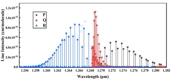 where is the second radiation constant, is the total partition function at the reference temperature, and E is the energy of the low-level state. The HITRAN database is the most commonly used source of reference molecular spectroscopic data for molecules of atmospheric interest. In this work, the 1.27 μm band line for an oxygen molecule was obtained from HITRAN on the Web. Figure 3 shows the O2 1.27 μm spectral line at 296 K found in HITRAN data [29], where P, Q, R represent the set of “local” quantum numbers for upper and lower rotational states.