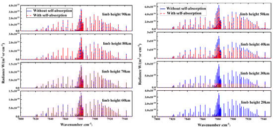 Figure 4 shows the infrared spectral radiance of the O2 7870 cm−1 band for the same path length (100 km) at a tangent height of 90–20 km and shows the contrast of spectral line brightness with and without the effect of self-absorption. As shown in Figure 5, in the height range above 60 km, self-absorption has little effect on spectral radiance, while in the range below 50 km, the effect is significant, and the phenomenon of self-absorption increases with a decrease of the tangential height. At the same time, the self-absorption phenomenon is very obvious in most of the Q-branch infrared atmospheric band with the highest radiation peak, which makes it difficult to use this band in many applications with a low tangent height.