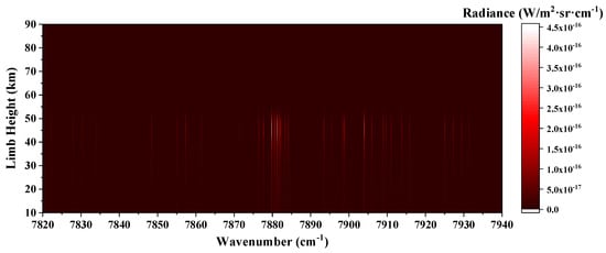 As shown in Figure 5, according to Equations (10)–(17), the limb infrared spectral radiance of O2 at the limb height of 10–90 km was simulated, with the observed height being 100 km. The atmospheric parameters are based on the 1976 US Standard Atmospheric Model [32]. Figure 5 shows that with the decrease of the limb height, the O2 spectral radiance of the 7870 cm−1 band first increases and then decreases, and the peak radiance exceeds 4.5 × 10−16 (W/m2·sr·cm−1) at 40–50 km. Above 60 km, the spectral radiance of O2 is lower because the molar fraction of O2 in the upper atmosphere is low, and the limb observation path is too long. Below 20 km, due to the strong self-absorption effect of the molecules, the spectral radiance of O2 is reduced.