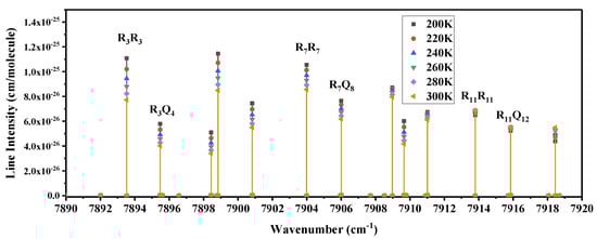 The temperature sensitivity of the selected spectral lines is shown in Figure 7. Among them, the group R3R3, R3Q4 and group R7R7, R7Q8 bands and two groups of lines have a strong temperature sensitivity, while the group R11R11, R11Q12 bands have a weak temperature sensitivity. However, considering the self-absorption effect of molecules, R3R3, R3Q4 is closer to the Q branch spectral line in the center of the 7870 cm−1 band, and the self-absorption effect is stronger, resulting in a narrow height application range. Therefore, the most suitable spectral lines for detection are group R7R7, R7Q8 and group R11R11, R11Q12.