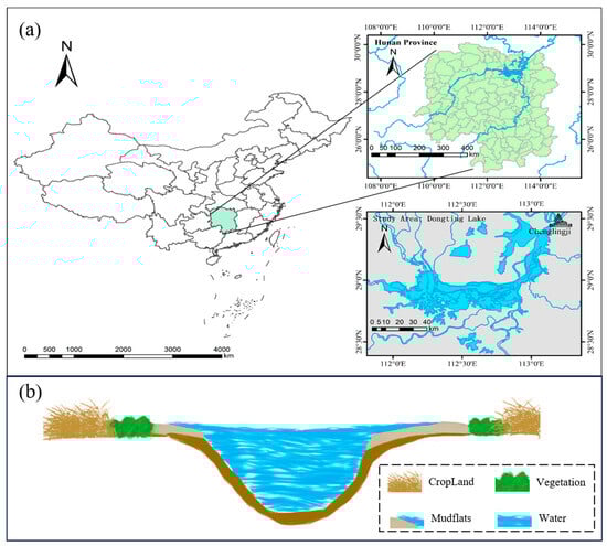 Overview of the study area. (a) The study area of Dongting Lake is located in Hunan Province, China. (b) The Schematic diagram of the Dongting Lake wetland profile. The blue color represents the water of Dongting Lake.