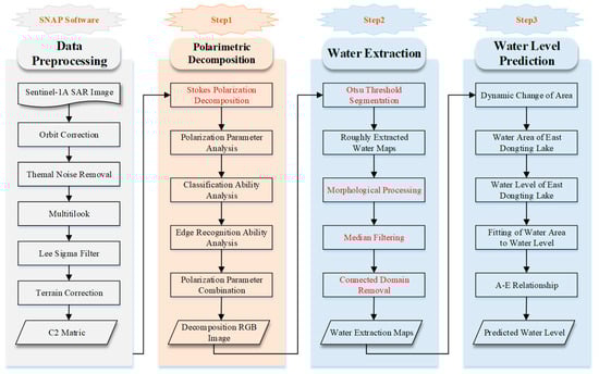 The workflow of the method in this paper is shown in Figure 2, which can be divided into four parts: data preprocessing, polarization decomposition, water area extraction, and water level prediction. Sentinel-1 SAR images are preprocessed through track correction, thermal noise removal, multilooking, filtering, and terrain correction [43]. Polarization decomposition is the key part of this paper. In this part, a Stokes polarization decomposition method is mainly used to decompose the dual-polarization data, and the unique advantages of polarization decomposition parameters for water area extraction are analyzed. The key water area extraction algorithms part mainly includes an Otsu threshold segmentation algorithm, morphological processing, median filtering, and connectivity domain removal. In the last part, the water area and water level data of East Dongting Lake are fitted to establish the A–E relationship, and then the water level is predicted.