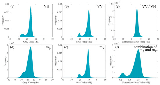 The frequency distribution histograms of sigma coefficients and polarization decomposition parameters. (a) The VH sigma coefficient, (b) the VV sigma coefficient, (c) the VV/VH sigma coefficient, (d) the polarization parameters, (e) the polarimetric parameters, and (f) the normalized energy histogram of the combination of the two parameters.