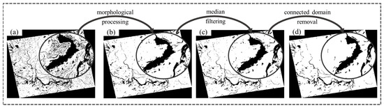 In Figure 4c, many non-lake water bodies such as ponds, reservoirs, and water in farmland will remain and the water bodies’ results are rough by using the Otsu threshold segmentation method. In this study, we use morphological operation, median filtering, and connectivity domain removal to post-process the water segmentation binary map to extract the lake water area of the target. The processing flow is shown in Figure 5.