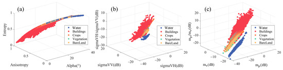 Distribution of polarization parameters of different ground features. (a) The distribution of five ground features in H-A-α parameters, (b) the VH-VV-VH/VV backscattering coefficient, and (c) the Stokes polarization parameters spaces.