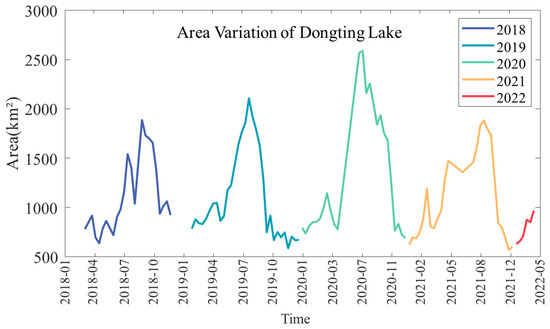 Figure 9 shows the variation curve of the Dongting Lake basin area over time. According to the curve, the minimum water area of Dongting Lake is 570.91 km2, the maximum is 2587.92 km2, and the average water area is 1124.27 km2. In the past five years, it is obvious that the overall water area of Dongting Lake in 2018, 2019, and 2021 is relatively small. In 2020, the overall water area of Dongting Lake is largest, which coincides with the historical hydrological data and the climate of more rainfall and a longer flood season in 2020 [29]. As observed from Figure 9, the changes in the Dongting Lake water area present obvious seasonal rules where the water area presents an increasing trend in the first half of the year and a decreasing trend in the second half of the year. The water area increases slowly from January to May, reaches its peak in August, drops sharply from September to December, and drops to the minimum value of the whole year. Generally, Dongting Lake is in the dry period in winter and the wet period in summer. From January to March, the area of Dongting Lake is unchanged, and the smallest in the whole year. The water area starts to increase slowly from March to May. From May, the water area of Dongting Lake increases sharply and reaches the maximum of the whole year in July and August when the wet season comes. Since September, the water area of Dongting Lake gradually decreases and reaches the minimum in December. This seasonal change is the general rule of the water area in a year, while the Dongting Lake basin area will also be biased every year due to other factors (for example, rainfall).