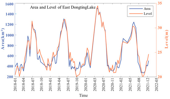 Variation curves of water area and water level in East Dongting Lake. The blue curve shows the change in water area over time and the red curve shows the change in water level over time.