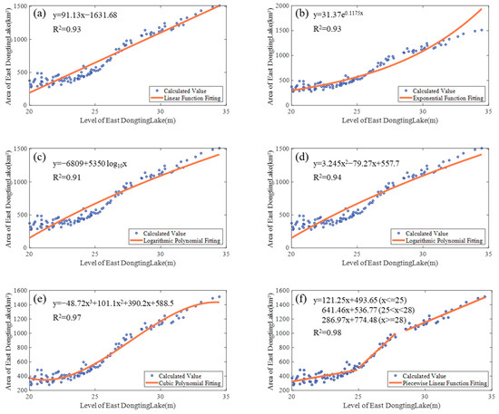 The relationship between the water level and the water area of Dongting Lake has been studied by many scholars [47,48,49,50,51,52,53,54,55,56,57]. The regression function model is mainly used to describe the correlation between the water area and water level elevation. Due to the different calculation methods for the water area and the different states of Dongting Lake at different times, it is impossible to use the same model to express the water level and water area. Therefore, according to the experimental data, we need to choose the most accurate regression relationship to describe the relationship between the water area and water level elevation of East Dongting Lake. In this paper, we draw the scatter plot of the water area and water level data of East Dongting Lake and adopt several common function models (including linear function, exponential function, logarithmic function, quadratic polynomial, cubic polynomial, and piecewise linear function) to fit the water level and water area of East Dongting Lake. The fitting curves of each function model are shown in Figure 11. The experimental data scatter is denser in the low-water area region, while it is more discrete in the high-water area region. To obtain a more accurate function model, we should pay more attention to the fitting of the low-water area. According to the fitting curve, all six regression models can achieve a better fitting effect on the whole. For the low-water-level data interval, the polynomial model and piecewise linear function have a better fitting effect, and the overall deviation is small. Using a linear function model will lead to the overestimation of the water area. Using an exponential function model, the water area will be both overestimated and underestimated in different-water-level-data intervals. Using a logarithmic function model will also produce the overestimation phenomenon. In general, both the cubic polynomial model and piecewise linear function model can achieve a good fitting effect. Since the water level and area of the lake are affected by the topography of the riparian, we think that the piecewise linear function describes the A–E relationship more appropriately.