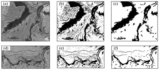 Results of water extraction from East Dongting Lake and South Dongting Lake. (a) The grayscale map of normalized polarization decomposition parameters of East Dongting Lake, (b) the binary graph after Otsu threshold segmentation of East Dongting Lake, (c) the water area extraction result through post-processing of East Dongting Lake, (d) the grayscale map of normalized polarization decomposition parameters of South Dongting Lake, (e) the binary graph after Otsu threshold segmentation of South Dongting Lake, and (f) the water area extraction result through post-processing of South Dongting Lake.