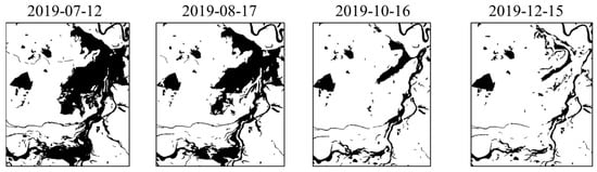 Comparison of Dongting Lake water extraction results in the wet season and the dry season: 12 July 2019 and 7 August 2019 indicate the wet season, and 16 October 2019 and 15 December 2019 indicate the dry season.