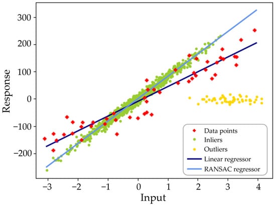 - Robust Linear Model Estimation Using RANSAC—Scikit-Learn 1.2.2 Documentation. Available online: https://scikit-learn.org/stable/auto_examples/linear_model/plot_ransac.html (accessed on 17 April 2023).