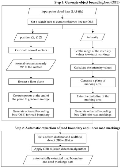 This section describes a method for automatically extracting road boundaries and linear markings from point cloud data. Figure 2 illustrates a flowchart of this method. The proposed methodology includes creating an oriented bounding box (OBB) for the markings and automatically extracting them by applying the OBB collision-detection algorithm (Figure 2). First, to generate the OBBs, the search area for extracting a reference line must be set. The reference lines of each road boundary and linear road marking were obtained using the position and intensity values. Based on the created OBBs, step 2 sets a search distance and width to detect collisions between OBBs. Then, we applied a collision-detection algorithm to automatically extract road boundaries and linear road markings from point cloud data.