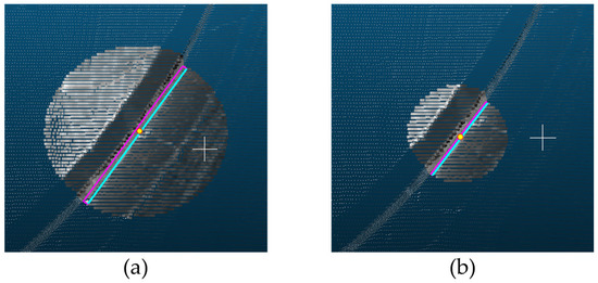 A floor plane can be generated by identifying the lowest points in the search area. Applying the search area can decrease the randomness and noise in the point cloud data. In particular, this search step determined the lowest points because the lowest point of the point clouds collected from the MMS represents the road surface. Therefore, defining the proper size and location of the search area is essential in terms of accuracy and conformity to extract the edge because it ends up being a reference line aligned with the u-axis of the OBB. The radius of the search area was set as 50 cm (Figure 4b). If it is set to a radius of 1 m, the road’s curvature is ignored; instead, a straight line is generated (Figure 4a).