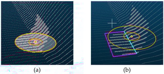 (a) Setting a search area (the large orange circle in (a) to extract a bottom plane. (b) Detecting the edge of the plane by setting the search area to include both the road surface and the boundary. The extracted edge of the plane (the sky-blue line in (b)) is a reference line for the oriented bounding box (OBB) (the pink rectangle in (b)).