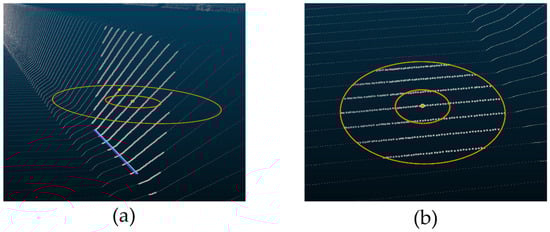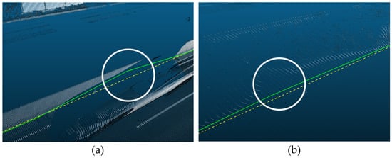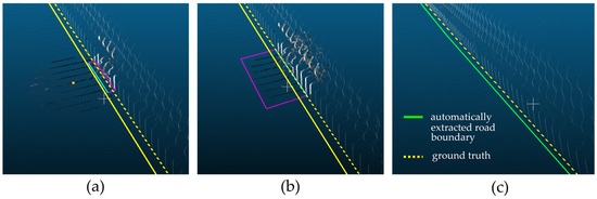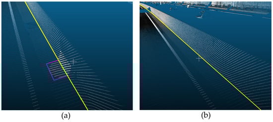 The location of the search area is also associated with not only the accurate extraction of the u-axis reference line of the OBB but also the generation of the road surface. Selecting the proper location of the search area can eliminate the need to pre-process the point cloud data. To generate an accurate reference line for the OBB, the search area should be located where the following conditions should be met: first, the boundaries of the road surface are clear, the direction can be confirmed, and the data should be acquired in areas with no lost data. For example, when the position of the search area is such that the boundary is identified, as shown in Figure 5a, the reference line for creating an OBB can be extracted accurately, as shown in Figure 5b.