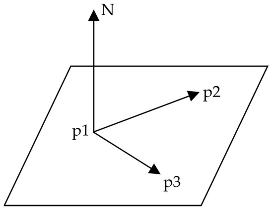 The plane fitted to the lowest points is defined by calculating the normal vectors of the points. Each point has a position in the point cloud data (x, y, z). Each point is collected, which together form a group of points to represent the appearance of an object. The higher the density of the point group, the more detailed the shape that can be expressed. Moreover, the point cloud data acquired from ground MMS surveys have an average precision of 2 cm; therefore, points with 2 cm errors along the y-axis were also included to fit the plane. In point cloud data, the edge of the road plane can be extracted by calculating the normal vectors based on the coordinates of each point and fitting the points to a plane. The normal vector is perpendicular to the plane. Assuming that there are three points (P1, P2, and P3) on the plane, the normal vector (N) to the plane can be obtained by calculating the cross product of the two vectors and (Figure 7).